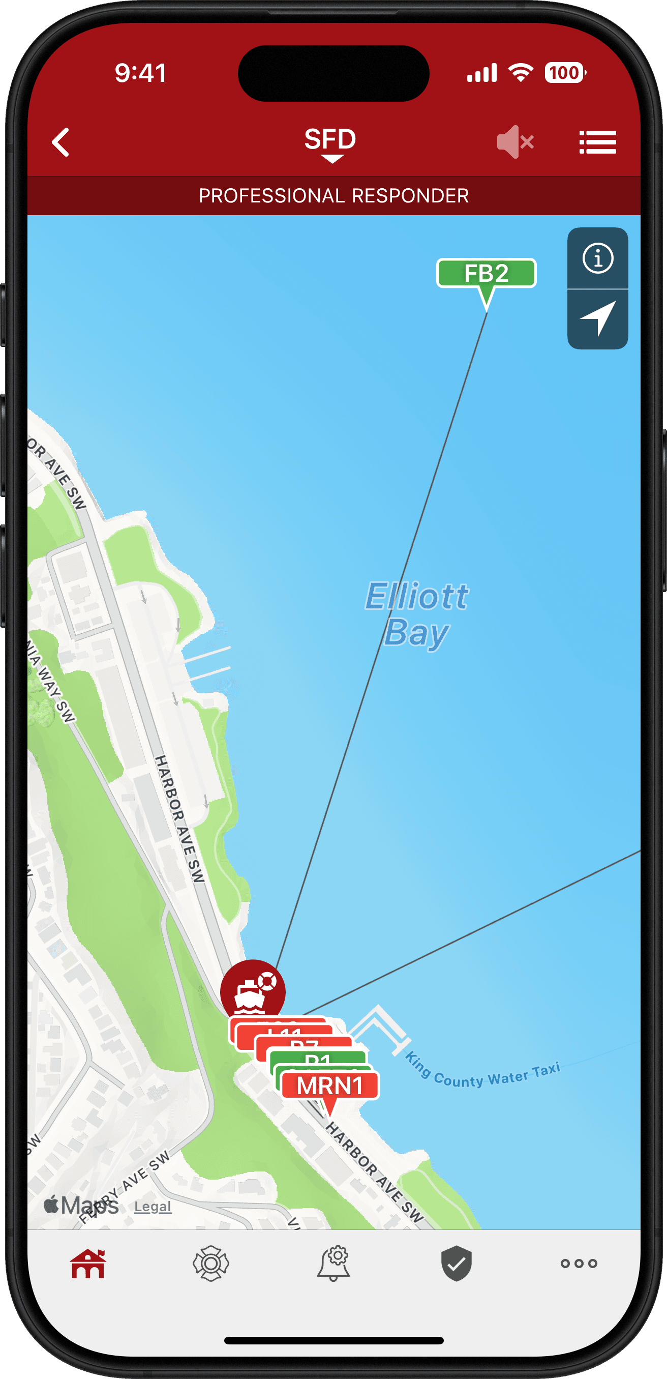 Units are displayed on the map color-coded according to their current dispatch status. Tap the icon to display additional unit information. Subtle lines indicate which units are traveling to which incidents.