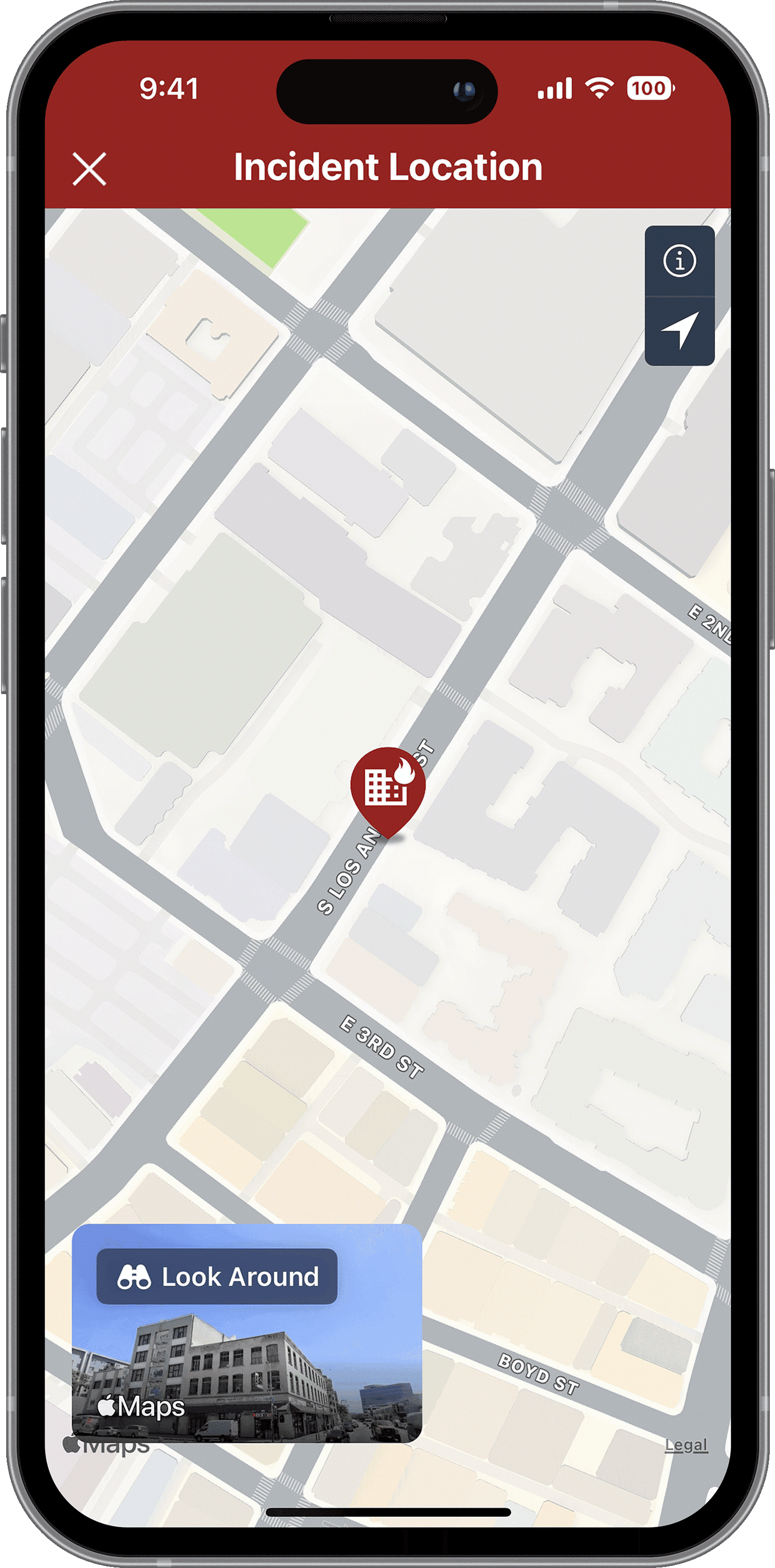 From a tap on the incident list, Professional Responders are provided additional details to improve their response capabilities and effectiveness. Available information varies between dispatch environments, but common data points include common place names, cross streets, radio channels, and incident narratives.