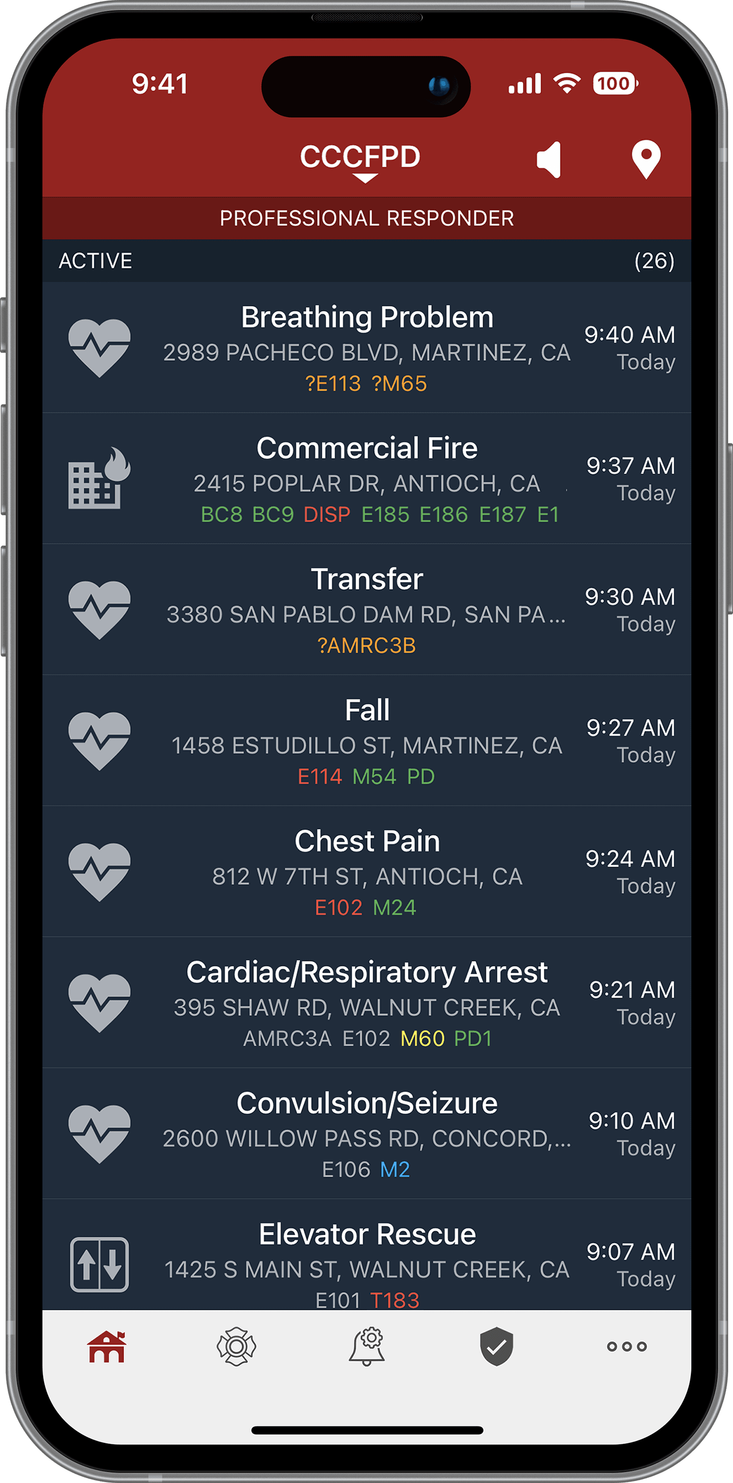 Professional Responders are active public safety employees, typically firefighters, paramedics, and law enforcement officers assigned Professional Responder status by their organization. Typically these employees respond and care for patients in residential settings while on duty. To encourage adoption, professional users are provided with specialized app capabilities for on-duty use. When off-duty, Professional Responders are alerted to all nearby cardiac arrest events in the jurisdiction.