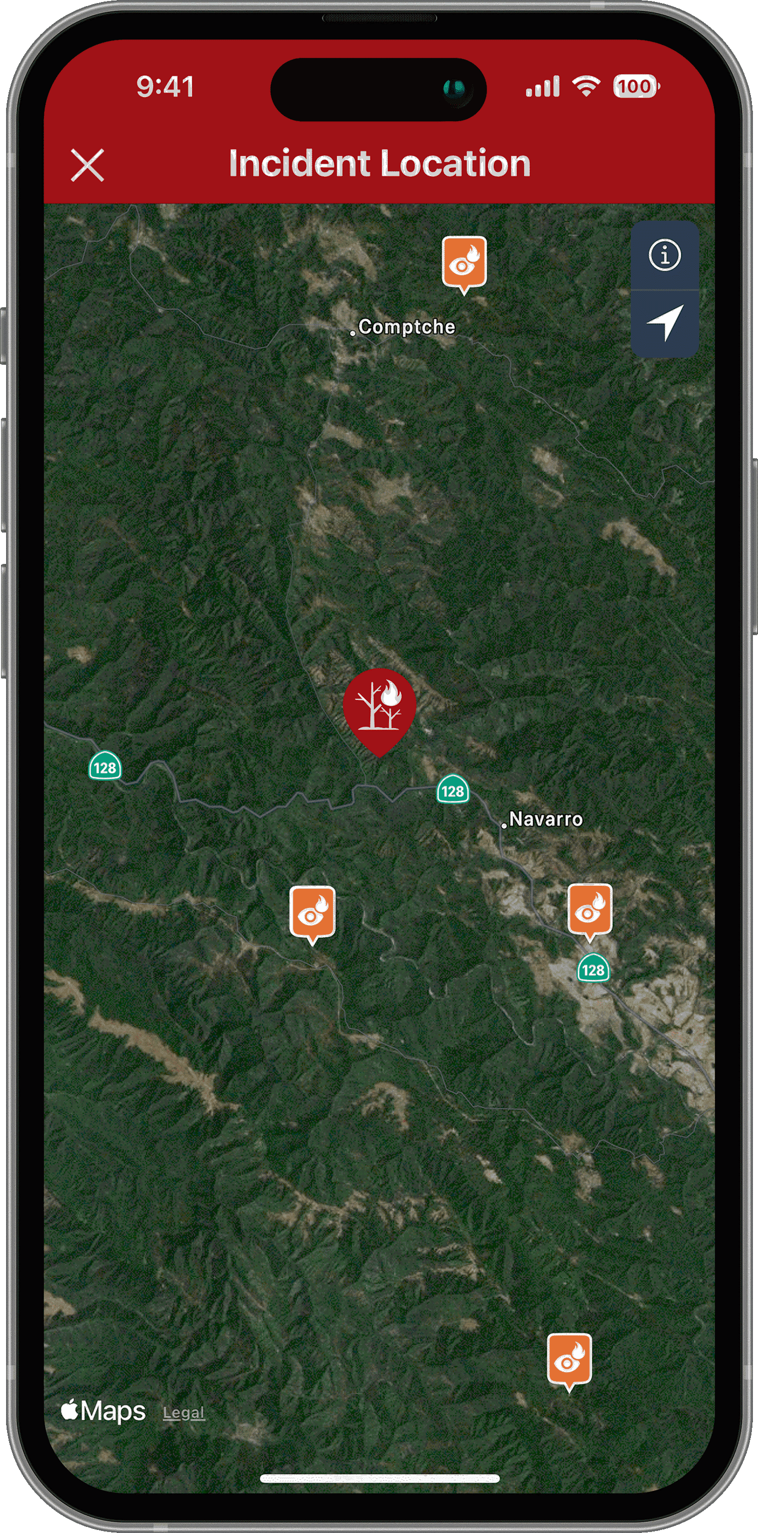 Professional Responders can receive immediate turn-by-turn driving directions to any incident by tapping the navigate icon on the incident detail thumbnail map. Other user types are not provided this functionality/icon on medical incident types.