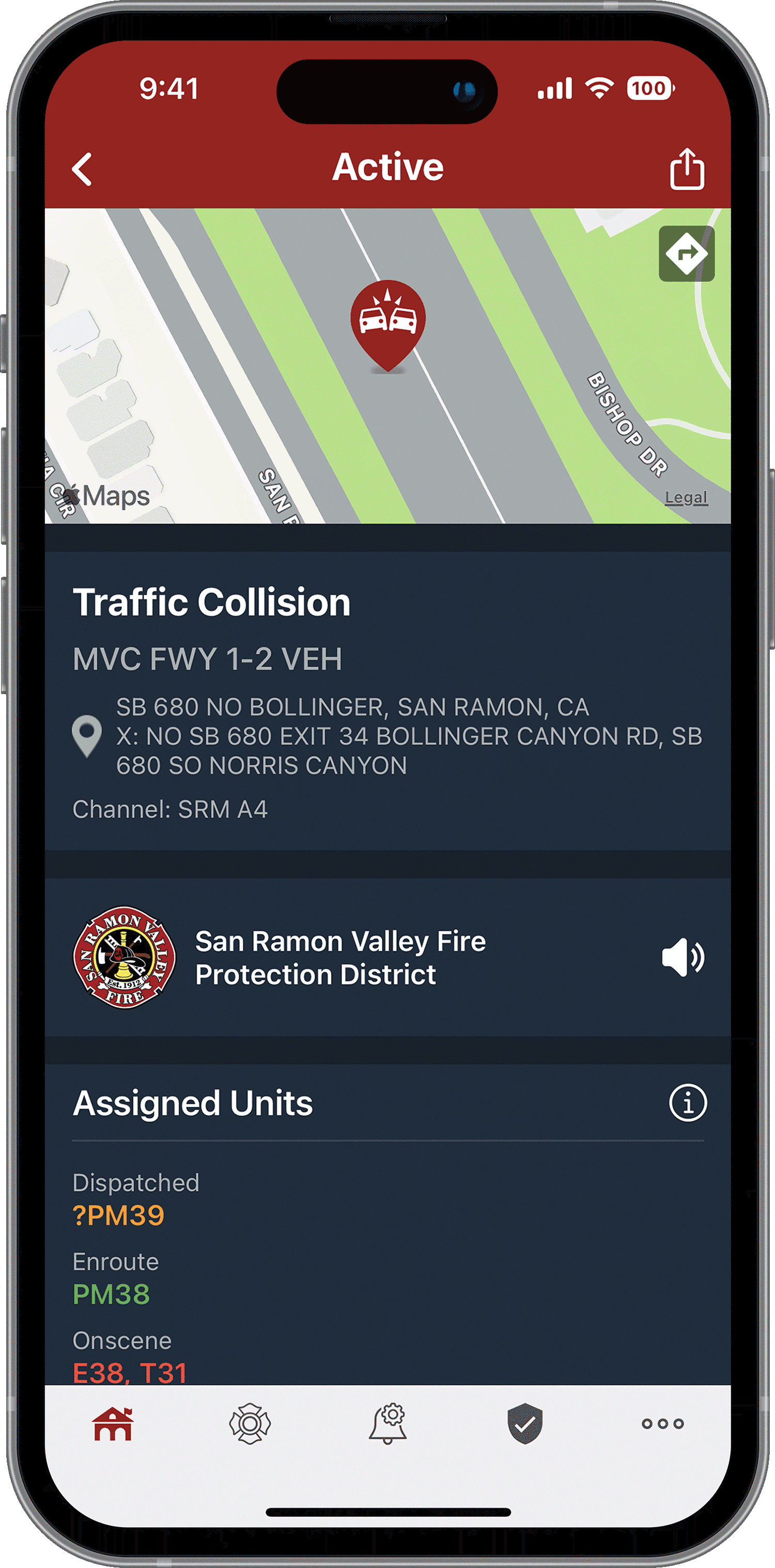 From a tap on the incident list, Professional Responders are provided additional details to improve their response capabilities and effectiveness. Available information varies between dispatch environments, but common data points include common place names, cross streets, radio channels, and incident narratives.