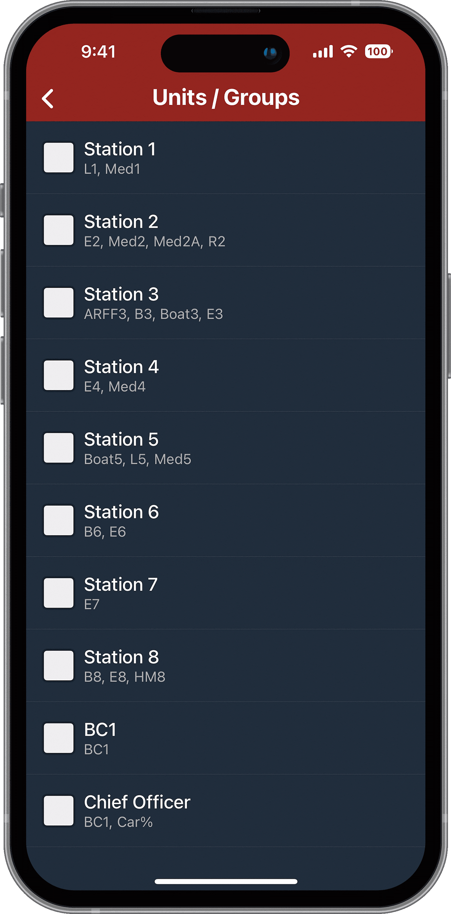 Unit/Group notifications allow Professional Responders to receive dispatch notifications for all incidents based on assignment, such as station or apparatus (e.g., notify me of all incidents for Engine 35).
